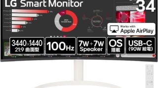 LG ディスプレイ 34SR63QA-W 曲面 ウルトラワイド sRGB 99%の評価LG 34SR63QA-W は 3440×1440 のUWQHD解像度と曲面パネルにより高い没入感を実現し、sRGB 99%の広色域で写真・動画編集にも十...