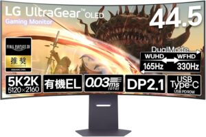 LG OLED 45GX950A-Bは、44.5インチの5K2K(5120×2160)有機ELパネルを採用したハイエンドゲーミングモニターです。800Rの強い湾曲により視界を包み込む没入感を実現し、0.03msの高速応答やHDMI 2.1対応で最新ゲーム機・PCの性能を最大限に引き出します。165Hz表示に加え、用途に応じて330Hzへ切り替え可能なDual Modeも搭載し、FPSから映像制作まで幅広く対応する次世代モデルです。