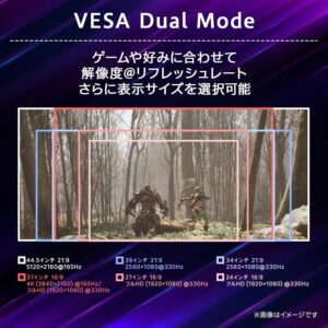 165Hz(5K2K)と330Hz(2560×1080)を切り替え可能なVESA Dual Modeを搭載。