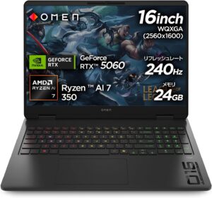 HP OMEN 16-ap(BM3P5PA-AAAA)は、AMD Ryzen AI 7 350とRTX 5060を搭載した16インチゲーミングノートです。24GBメモリと1TB SSDにより高速処理と大容量を両立。WQXGA・240Hzの高品質ディスプレイでゲームも作業も快適。高い冷却性能とAI処理対応で幅広い用途に適した高性能モデルです。