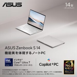 ASUS Zenbook S 14 UX5406SA-U7161WH は、最新の Intel Core Ultra 7 256V を搭載した高性能・軽量モバイルノートです。14型の 2880×1800 有機ELディスプレイにより発色が鮮やかで、映像・写真編集にも向きます。16GBメモリと 1TB SSD を備え、日常作業からクリエイティブ用途まで快適。重量は約 1.2kg と持ち運びやすく、Wi‑Fi 7 に対応して高速通信が可能。薄型ながら冷却性能も高く、AI機能を活かした Copilot+ PC として生産性を大きく高めるモデルです。